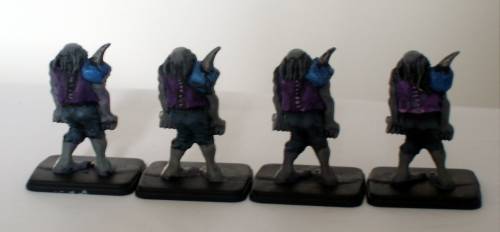 These are converted Heroquest Zombiess that my Dad chopped down and even made them wee shoulder pads out of milliputt and spare spikes. These took me about two hours or so I think. For a comparison that maybe just getting the base colours done on a time consuming mini. :)