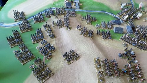 | The French Division of Vinceti (Bavarian) - on the left of the picture, while Seydewitz cavalry Division (bottom right) sweep behind the beleaguered Austrian Division of Somariva - who break in the command phase. Lorencez Elites hold the centre ground and are about to take the town of Oberlaichlang - depriving the Austrians of 1 victory point. |