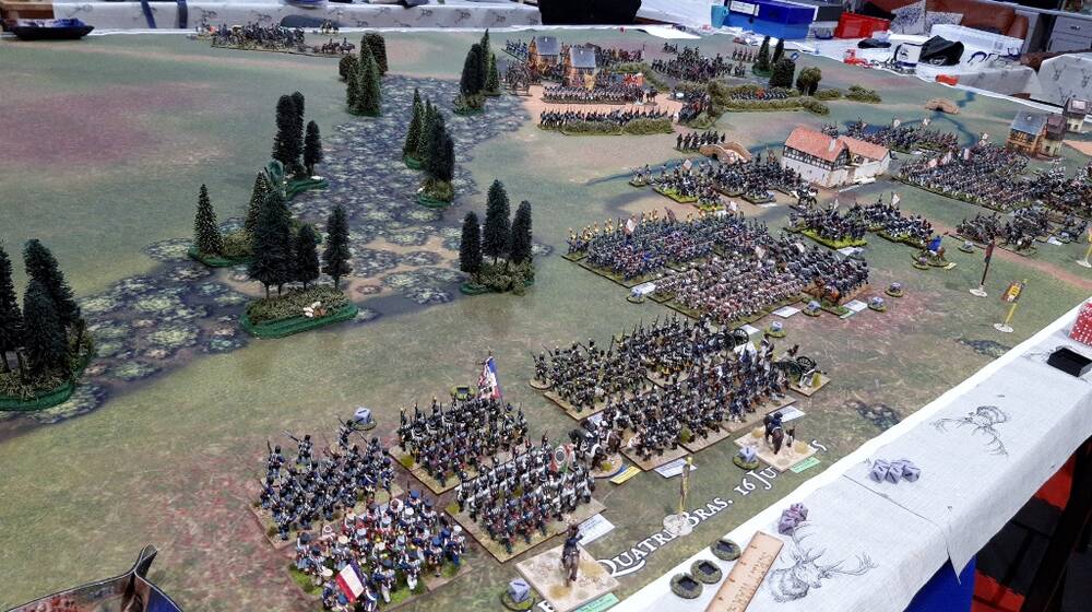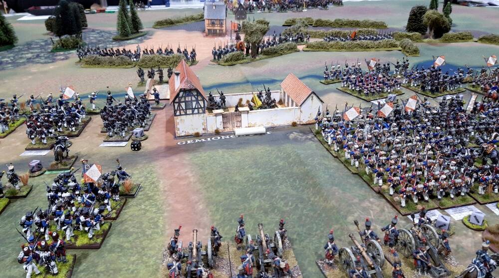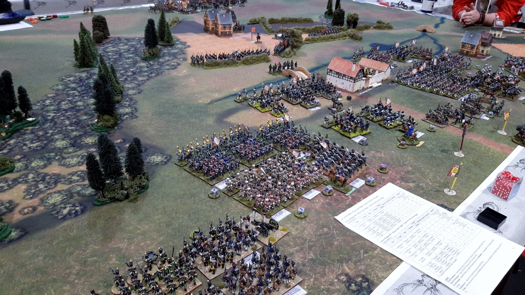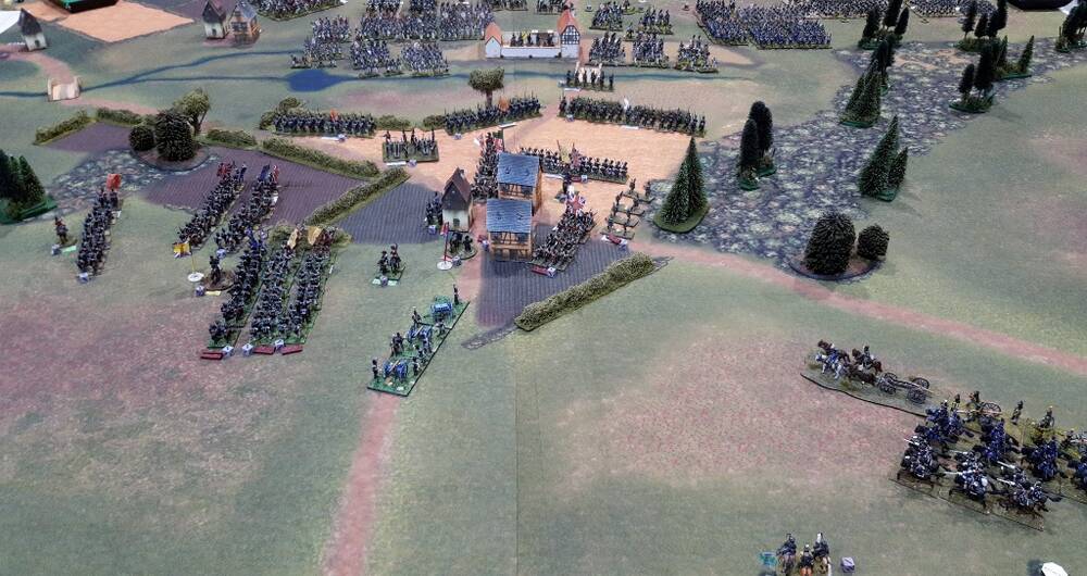 From French perspective. Showing the CinC and Divisional General flags (still to be placed with figures) but will allow them to be found more easily later on in the battle. The orders dice are also clearly seen, basic grey with the battalions, grey with red splatter on the Divisional / CinC dice. Also each battalion has a unit information tag showing what unit it is, under which Brigade / Divisional General staff rating, and stats and skills. Here the French have managed to get a disorder on the Jagers in Gemioncourt, who in turn have caused a casualty on a battalion with traversing fire.