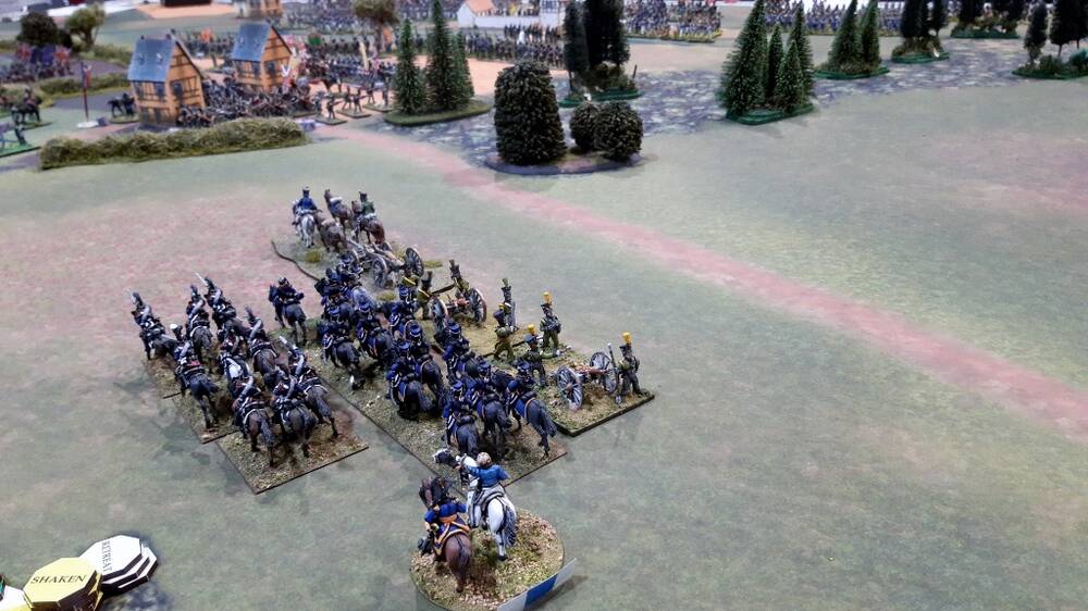 French artillery sets up to remove the Jagers. The black dice showing the traversing shot on a battalion of Tissot from the Jagers. Tissot’s units have RUN to get into position and for us means they cannot shoot.
