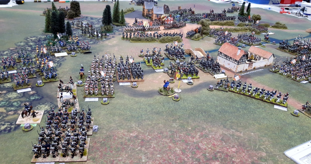 Bylandt suffers first hit as the left flank militia are defeated by Husson of Bachelu’s Brigade (the result here the victorious attacking battalion goes to the left positioned behind the hedge, whereas the other 3 of Husson’s battalions form up to attack the other Militia to the right), Bylandt loses 1st Militia (2 VPs) and the Horse gun (2 VPs) that was supporting it. The Jagers in Gemioncourt are disordered again but save against hits. The large Belgian line has also taken 2 casualties and disordered from Tissot’s skirmishers. Vinke’s Militia get disordered take Freshly raised test and Panic (need 6s). The British have their First Fire tokens and trying to get ready to repel the French.