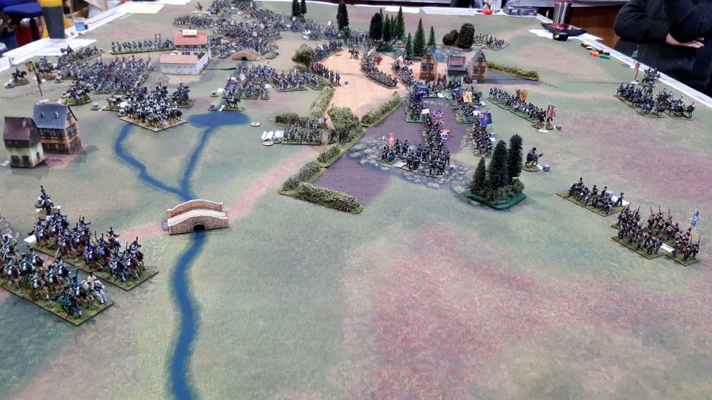 French move 3, then allies move. Van Merlin cavalry continue to cover left flank, but leave the horse artillery to cover the right flank. Kempt more or less in place, Pack and Vinke almost. Quatre Bras has the West section occupied by a small Bylandt battalion, and the Northern section now occupied by Pack’s small Highlander unit. The Southern section is still empty.