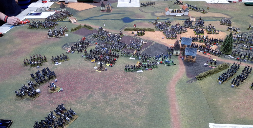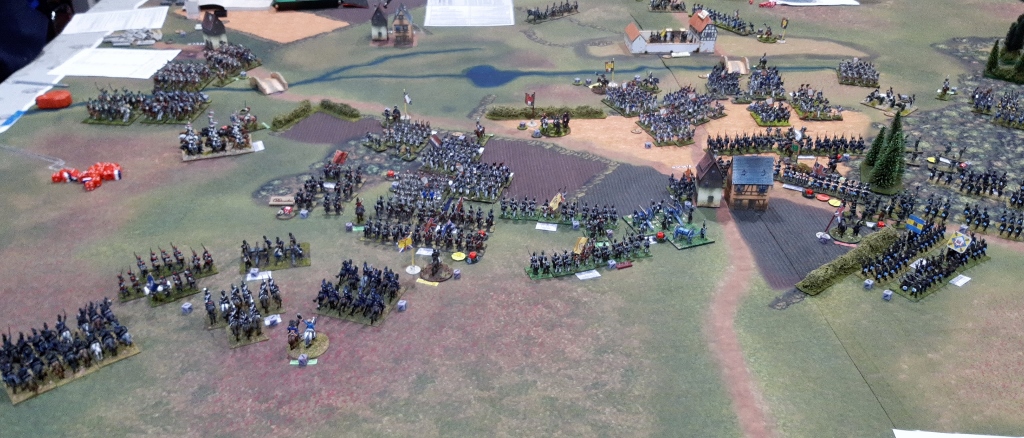 Brunswick cavalry with Van Merlin protect the left against Pire, and support Vinke, Pack gets a flank attack on a Campi unit (so it cannot get supports) but this results in a draw allowing the unit to turn to face next turn.