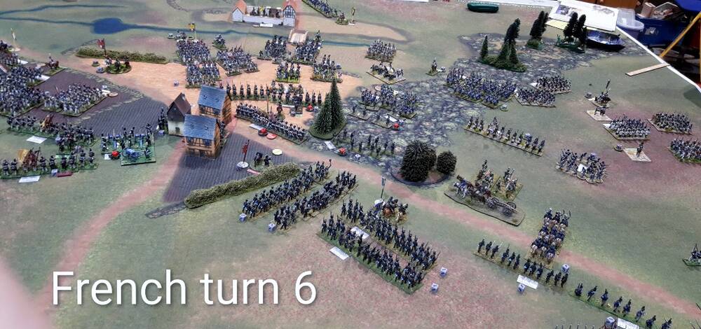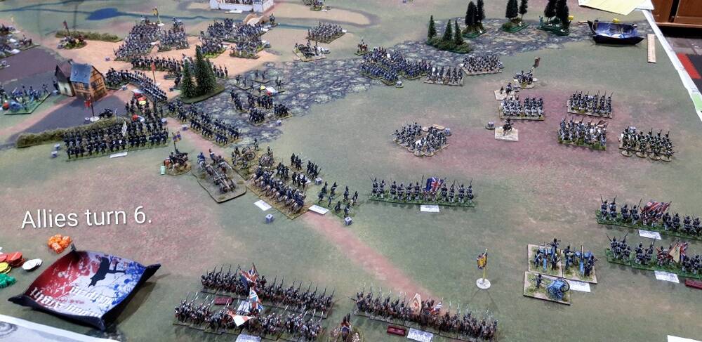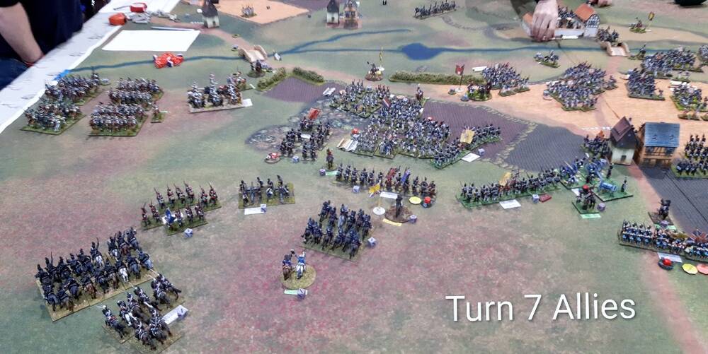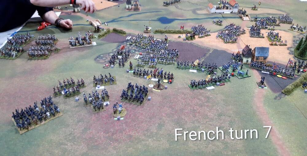 Battlefield after turn 6. Wellington reminds Brunswick of his orders and new support comes from the infantry on the West of Quatre Bras, and the cavalry move to protect the East side.