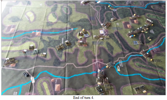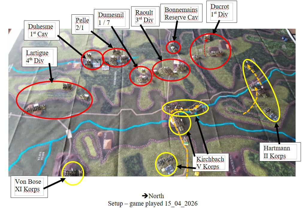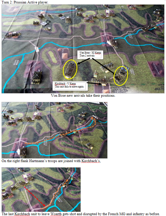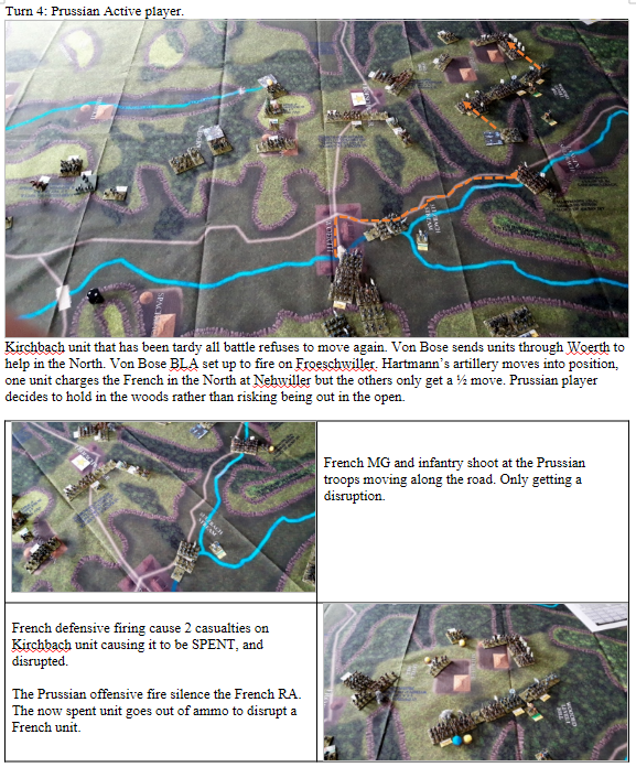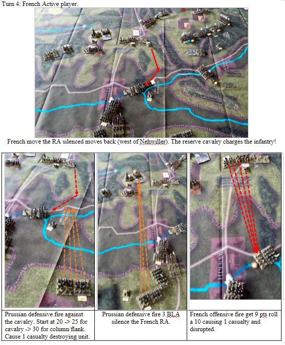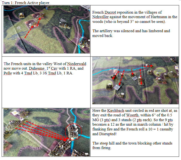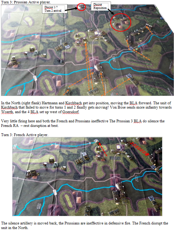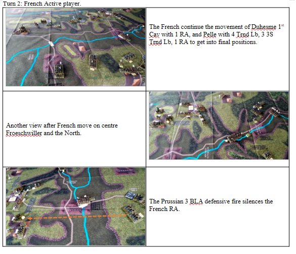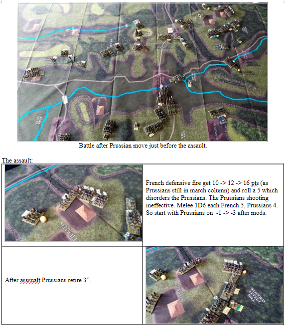 We have played Froeschwiller several times and the French superiority in small arms fire requires the Prussians to carefully position themselves in cover. They never win in a small arms exchange with the French. The Prussians must resist the feeling to attack until they have several units ready to charge out. Forcing the French to distribute their fire across many targets. All too often the Prussians either go too early or too many units fail to activate with a NO MOVE or ½ MOVE which can be a disaster with all the steep hills and woods.