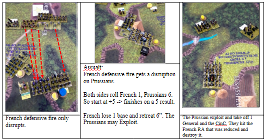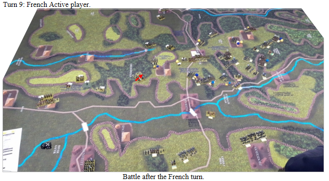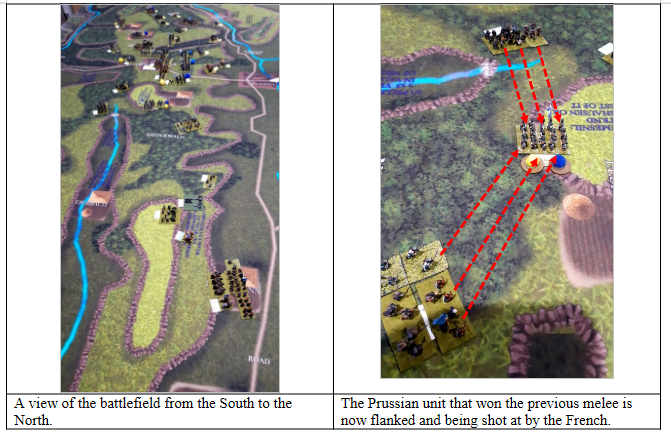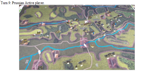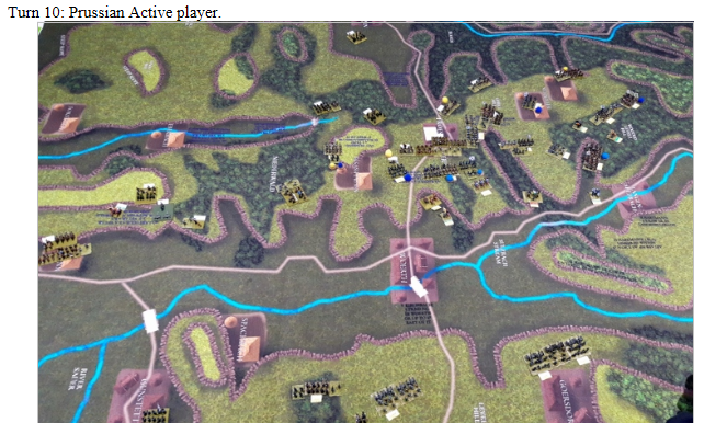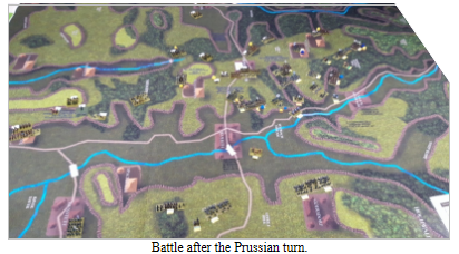 As the scenario requires the Prussians to get at 3 victory points to win and they currently have 0 we stopped at this point. Conclusion French victory.