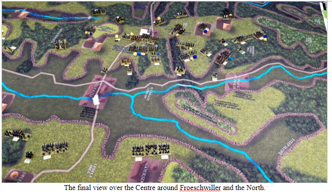 Prussians make one last push on Froeschwiller using units from the North and East. Again the move rolls were only successful in 1 in 3 most halted or only got a half move. But contact was made so an assault is possible.